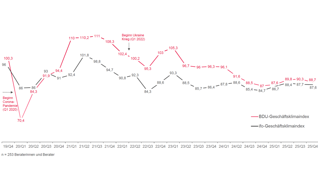 Der Geschäftsklimaindex im Consulting zeigt im letzten Quartal 2025 eine leicht rückläufige Seitwärtsbewegung. Dabei nähert er sich mit einem Wert von 88,7 (Q3 2025: 90,3) weiter dem ifo-Geschäftsklimaindex (87,6) an. Die aktuelle Geschäftslage ist zwar im Vergleich zum Vorjahr ähnlich, allerdings sehen die Unternehmen für 2026 deutlich positiver in die Zukunft. 30 Prozent der Beratungen erwarten günstigere Geschäftsaussichten (Q4/24: 26%) und nur 23 Prozent gehen von ungünstigeren Geschäftsaussichten aus (Q4/24: 30%).
