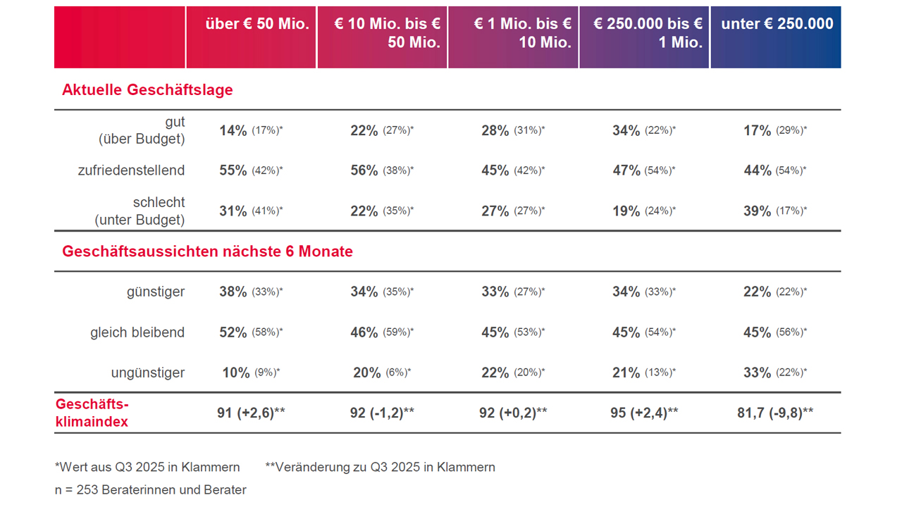 Bezogen auf die Unternehmensgröße spüren kleine Beratungen die aktuelle Zurückhaltung im Markt am stärksten. Hier ist der Geschäftsklimaindex, der die aktuelle Geschäftslage sowie die Zukunftsaussichten umfasst, um fast zehn Punkte auf 81,7 gefallen. Am positivsten zeigt sich der Index der großen Beratungen (+2,6 Punkte) und der Beratungen zwischen 250.000 Euro und 1 Mio. Euro Umsatz (+2,4 Punkte).