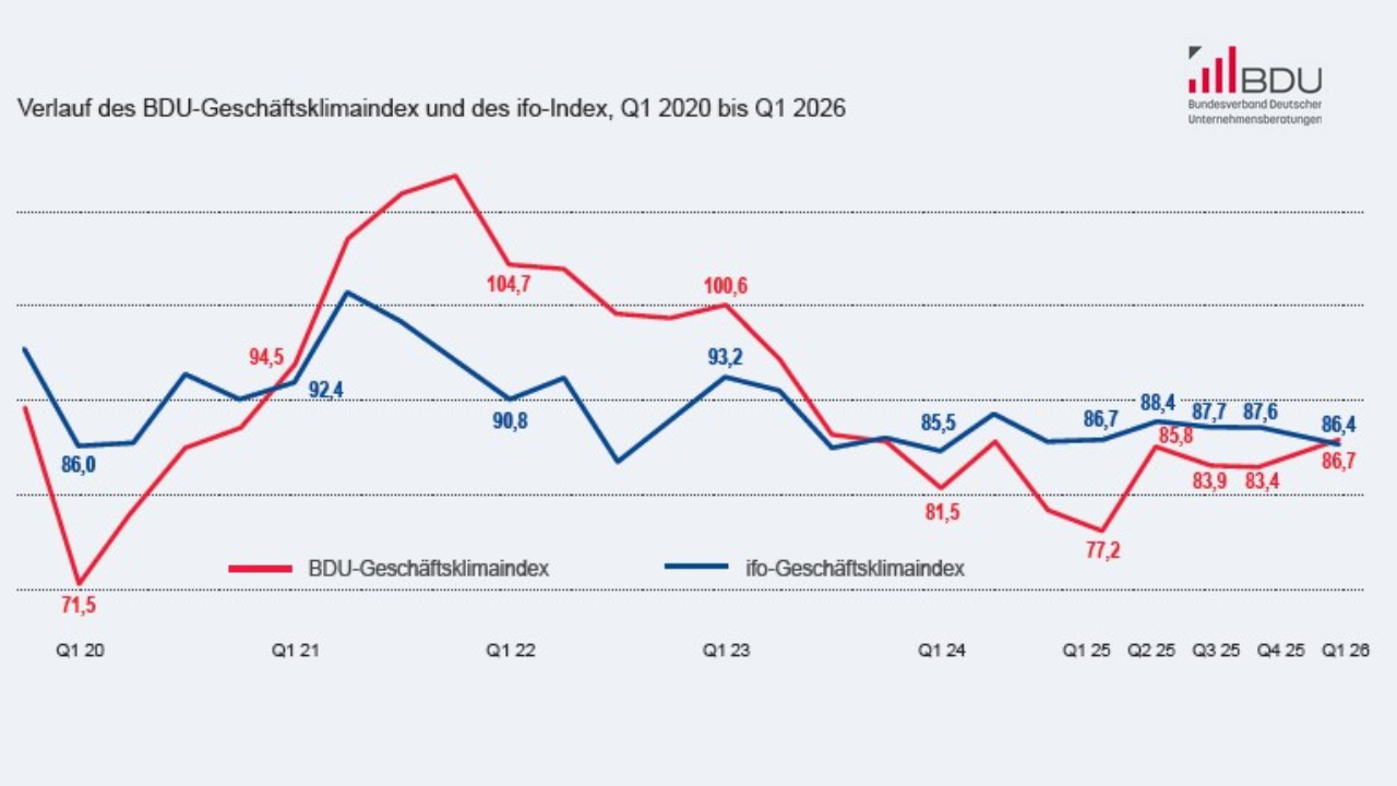 Die Stimmung in der deutschen Executive-Search-Branche hellt sich zu Beginn des Jahres 2026 leicht auf. Der Geschäftsklimaindex des Bundesverbandes Deutscher Unternehmensberatungen (BDU), der quartalsweise erhoben wird, steigt im ersten Quartal auf 86,7 Punkte und entfernt sich damit weiter von seinem letzten Tiefstand Anfang 2025.