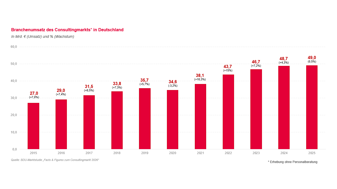 Wie steht es um die wirtschaftliche Lage im Consulting? Der BDU-Geschäftsklimaindex liefert regelmäßig fundierte Einblicke in Erwartungen, Trends und Herausforderungen der Unternehmensberatungen und Personalberatungen.