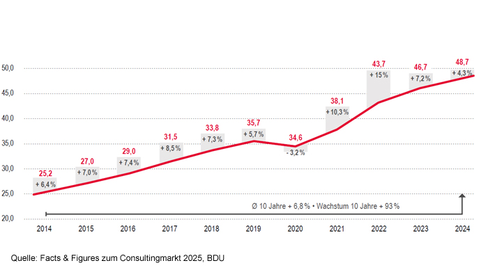 NewsartikelLeichtes Wachstum der Consultingbranche in Deutschland trotz schwächelnder WirtschaftBonn, 31. März 2025 (bdu) – Der deutsche Consultingmarkt ist im Jahr 2024 um 4,3 Prozent gewachsen und erreicht einen Gesamtmarktumsatz von 48,7… Weiterlesen