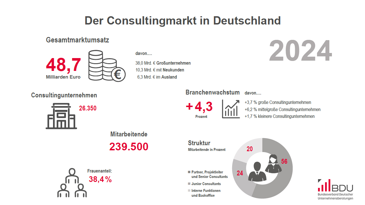 Der deutsche Consultingmarkt ist im Jahr 2024 um 4,3 Prozent gewachsen und erreicht einen Gesamtmarktumsatz von 48,7 Milliarden Euro. Für das laufende Geschäftsjahr erwarten die Consultants ein Wachstum von 6,4 Prozent, was den Gesamtmarktumsatz auf 51,8 Milliarden Euro ansteigen lässt. Damit würde die Consultingbranche in Deutschland erstmals die 50-Milliarden-Euro-Grenze überspringen.